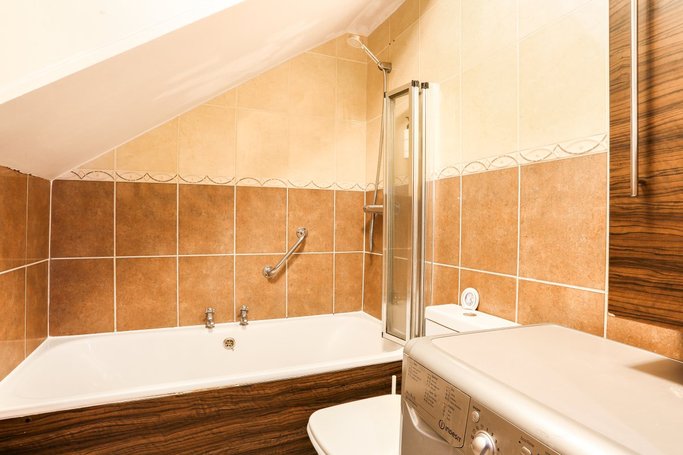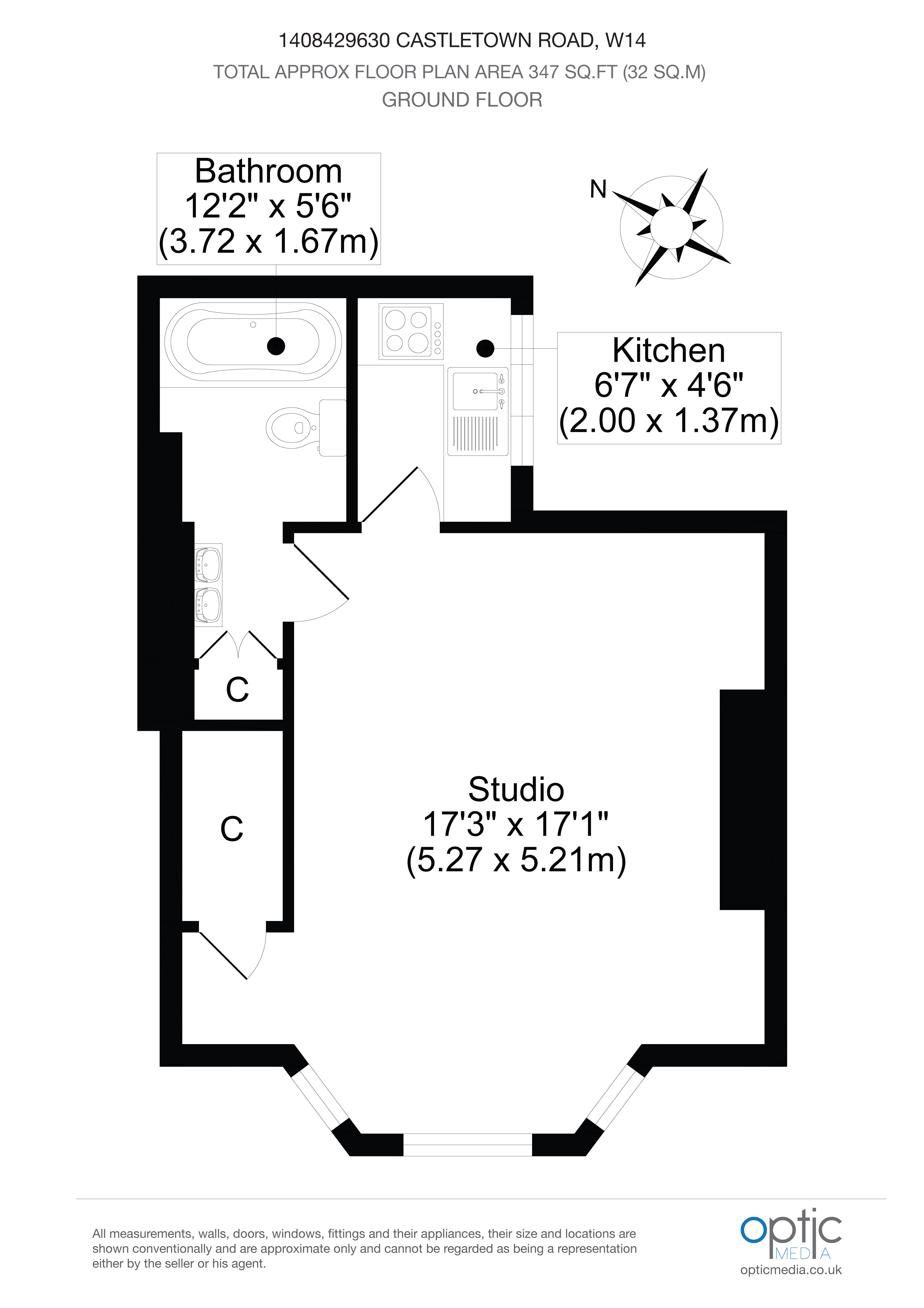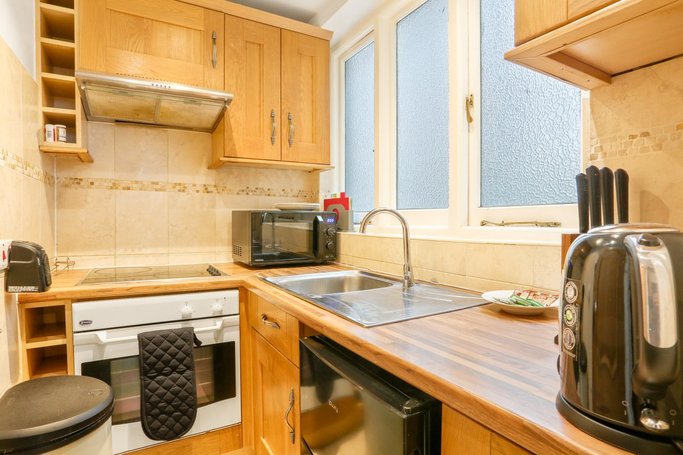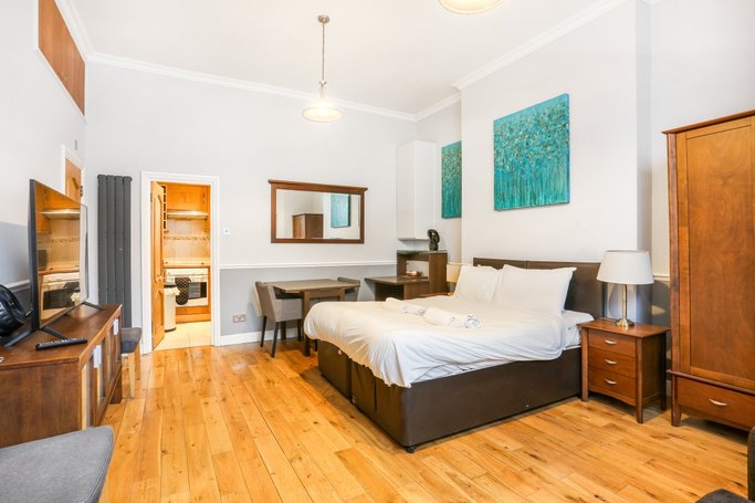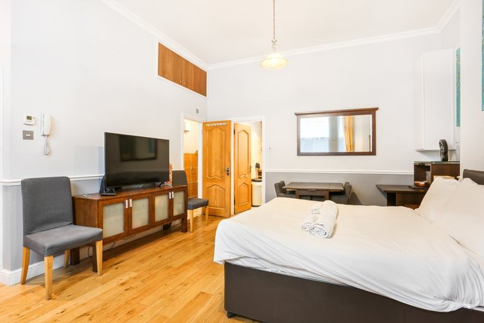 A large studio room, with a seperate kitchen and bathroom. Located on the ground floor. The studio has a washing machine in the bathroom, and an oven in the kitchen.
